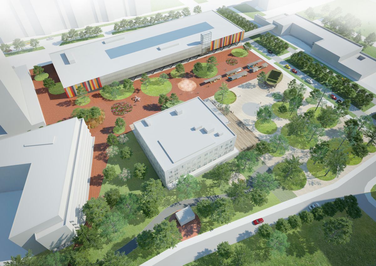 Všechny části území jsou propojeny kruhovými ostrovy se zelenými nebo zpevněnými plochami s výsadbou stromů.