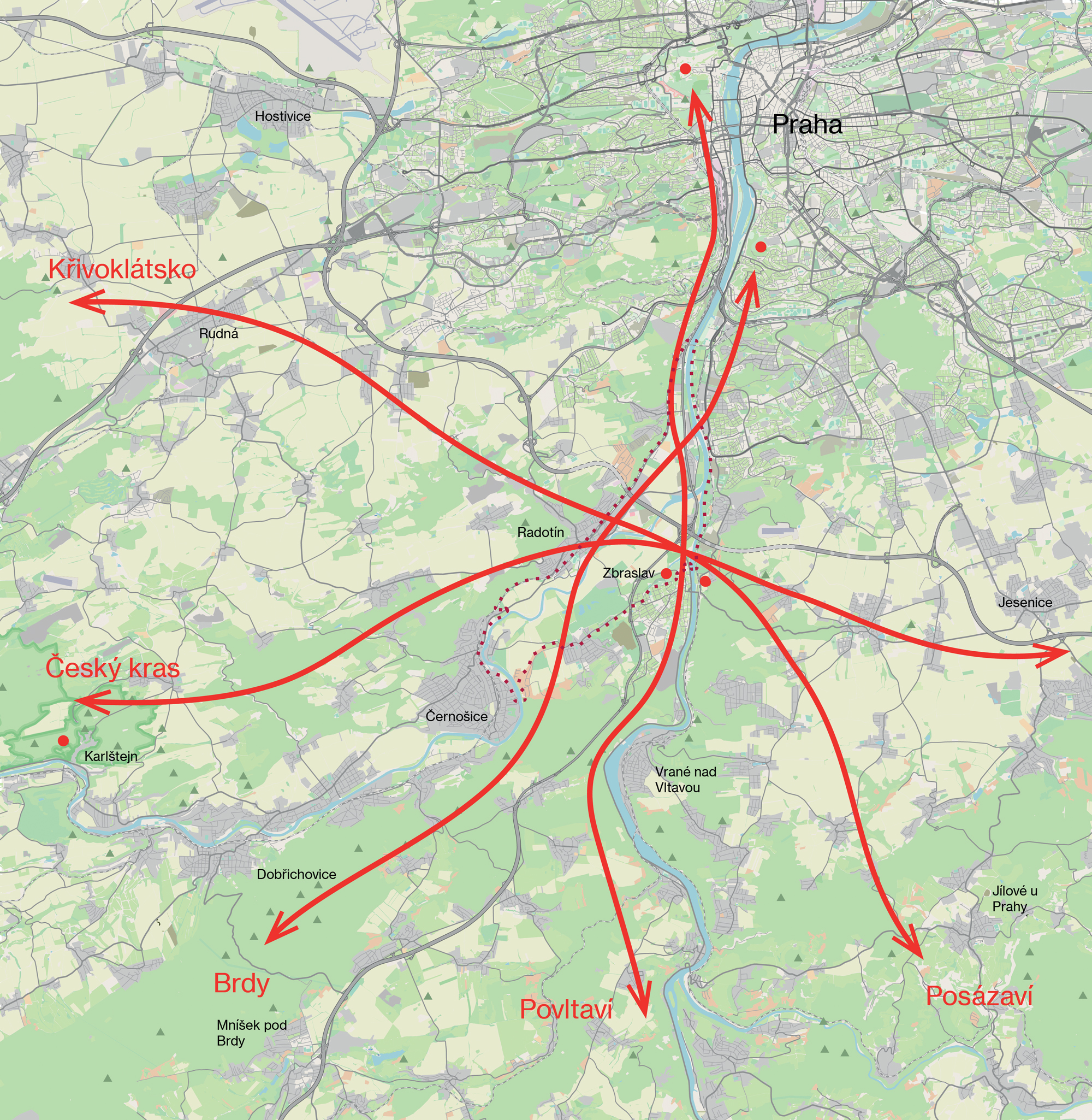 Soutok Vltavy a Berounky tvoří přirozenou přírodní bránu do krajinných oblastí v jižním, jihovýchodním a jihozápadním sousedství Pražské kotliny.