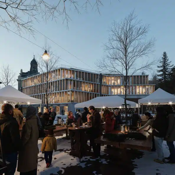 Nosný systém tvoří kombinace železobetonové a dřevěné konstrukce, která umožňuje využívat výhod obou principů a zároveň snižovat environmentální zátěž. Dům je navržen v pasivním standartu. Parkoviště před radnicí je upraveno jako víceúčelový prostor, využitelný pro příležitostné komunitní nebo kulturní akce.